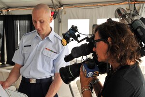 Freedom Wing leadership take a selfie Saturday at the start of the, standing room only, bi-annual commander's call. Col. David Pavey, right and Command Chief Master Sgt. Kevin Warbrick, left, recognized award winners, relayed command messages and thanked the wing's Reserve members for their