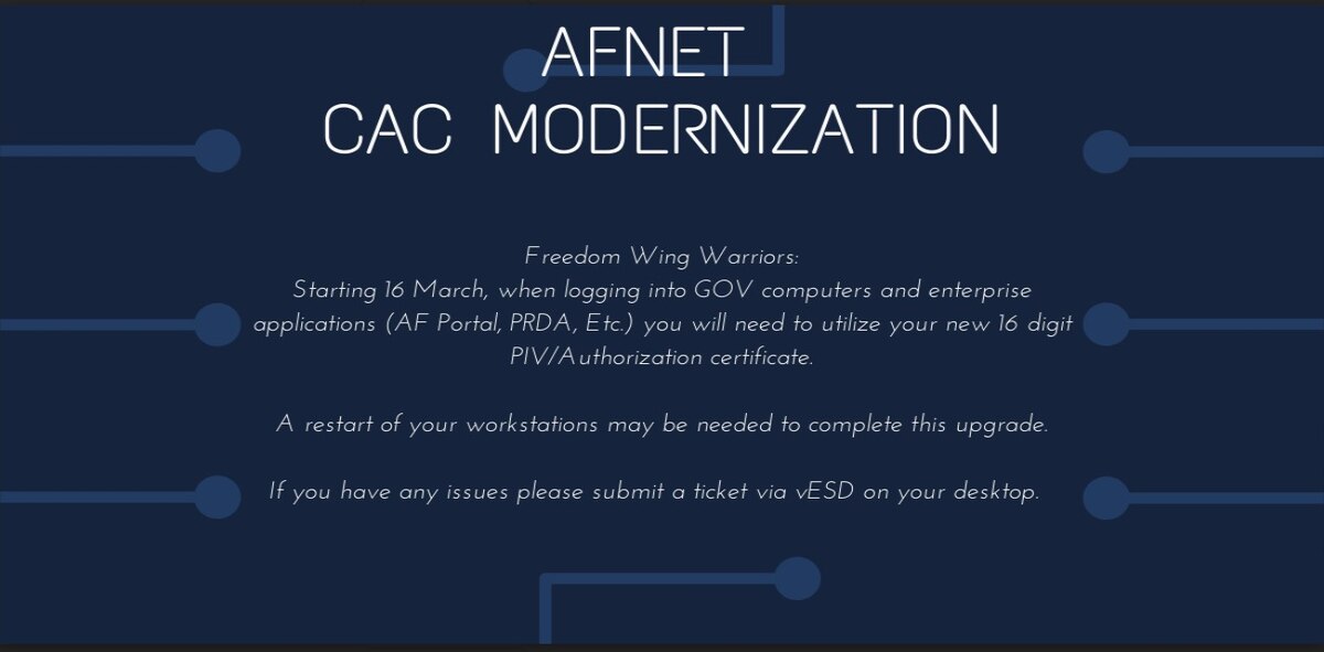 Why: In an effort to decrease the amount of certificates available for authentication AFNET is migrating user accounts from the 10 digit email certificate (1234567890@mil) to the 16 digit PIV certificate (1234567890123456@mil). The PIV will be utilized to perform a login to a computer as well as to access enterprise applications ie. AF Portal, TBA, PRDA, Remedy. Prior to the migration users will receive an email from AFPKI/AFDS stating that the member will be migrated. After the migration